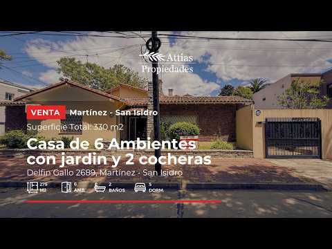 CASA EN UNA DE LAS MEJORES ZONAS DE MARTÍNEZ<br> <div><br></div><div>COCHERAS PARA 3 AUTOS</div><div>DORMITORIOS EN PLANTA BAJA Y PLANTA ALTA</div><div><br></div><div>-> NO TE PIERDAS EL VIDEO CON EL TOUR COMPLETO POR TODA LA PROPIEDAD</div><div><br></div><div>Superficie Total: 330 m²</div><div>Superficie Cubierta: 250 m²</div><div><br></div><div>Casa en venta en Delfín Gallo 2689, Martínez, con gran potencial en una de las zonas más exclusivas y residenciales.</div><div><br></div><div>Distribuida en dos plantas:</div><div><br></div><div>3 dormitorios en planta baja, perfectos para quienes buscan comodidad</div><div>2 dormitorios en planta alta, amplios y luminosos</div><div>2 baños completos y 1 toilette</div><div>Amplio living y living comedor con vistas al jardín</div><div>Garaje interno para 1 auto y espacio para 2 autos más en el jardín/patio</div><div>Parrilla ideal para reuniones al aire libre</div><div>El jardín trasero brinda el espacio ideal para disfrutar con la familia y hasta sumar una pileta.</div><div><br></div><div>Cerca de colegios, comercios y con rápido acceso a vías principales. ¡Una casa que vale la pena visitar!</div><div><br></div><div>Ubicación:<div>Excelente zona residencial de Martínez, a sólo 5 cuadras de Av. Alvear y de la estación, rodeada de casas modernas, árboles y tranquilidad.</div><div><br></div><div>Aviso legal:</div><div>Las medidas y superficies expuestas surgen de la información suministrada por el propietario. La empresa no se responsabiliza por la exactitud de las mismas.</div><div><br></div><div>Attias Propiedades – CMCPSI 5372</div></div><br> <br> <br>